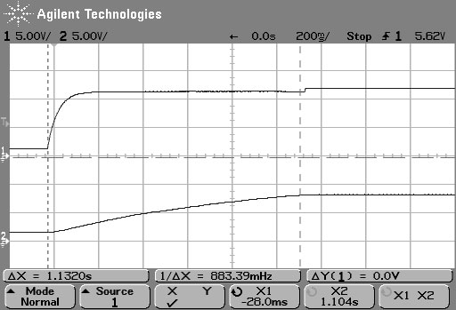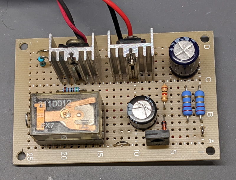 HIチャンネル側のスタンバイ機能が基板の都合上使えませんので12V電源そのものをON-OFFします。そのため電源コンデンサーへの突入電流が電源スイッチに流れます。恒久的には(また2年ぐらい使うつもりです)スイッチの接点が耐えられないと思いますので接点保護を入れます。スイッチON時には4.4Ωを通じてピーク電流3Aで電源コンデンサーに充電し、1秒程待ってから4.4Ωをリレー接点でショートします。低音用アンプはその後スタンバイ解除される様にタイミングを取ります。