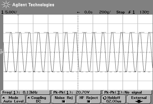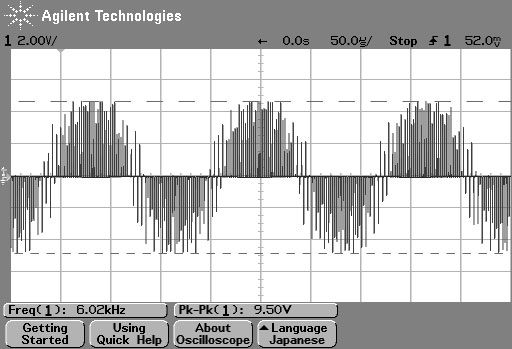 高音チャンネルの波形です。見違えるように綺麗です。 20V P-P出ています。 |