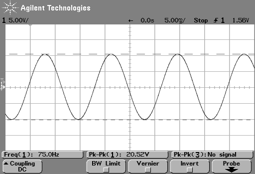 低音チャンネルの波形です。こちらは変化ありません。 こちらも20V P-P出ています。 |