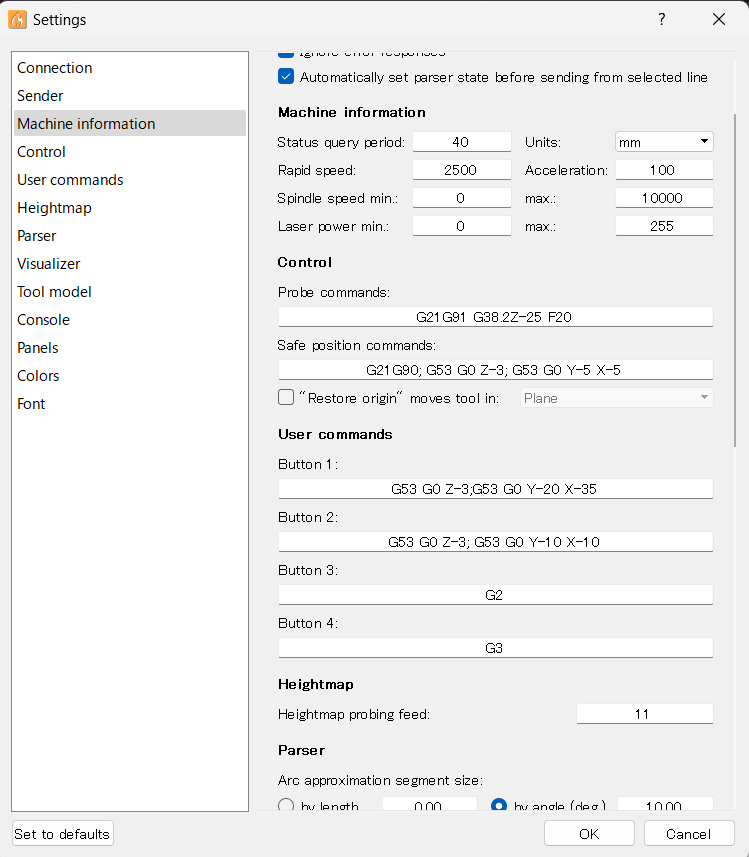 Candleに“UserCommnd”ボタンがあります。“SafePsition”ボタンも同様ですがSettingメニューから動作を登録することができます。 座標軸原点が不定だと(作業ごと毎回異なると)あまり意味はないですがハードウェアリミットスイッチを取り付けて等して必ず機械座標を確定する場合には、定位置に移動してくれるボタン登録が便利です。 |