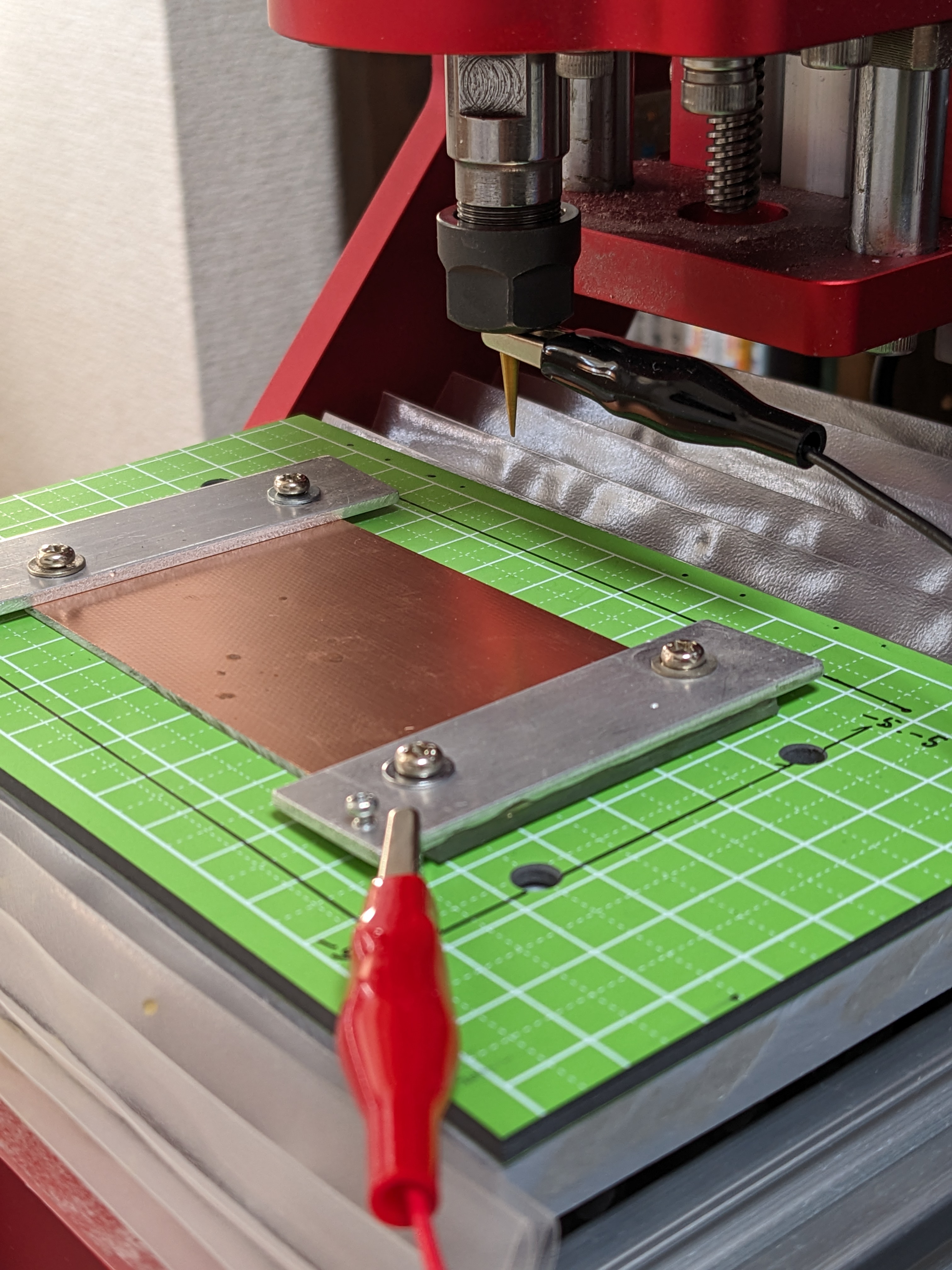 0点プローブです。ミノムシクリップで、片側をカッターにもう一方を基板銅箔の接続します。クランプに導体を使えば接続は簡単です。基板のGNDとCNC本体:切削モーターの軸が電気的に接続されている場合は極性がありますがそうでなければ無極性です。(接続されていない例が多いようです) |