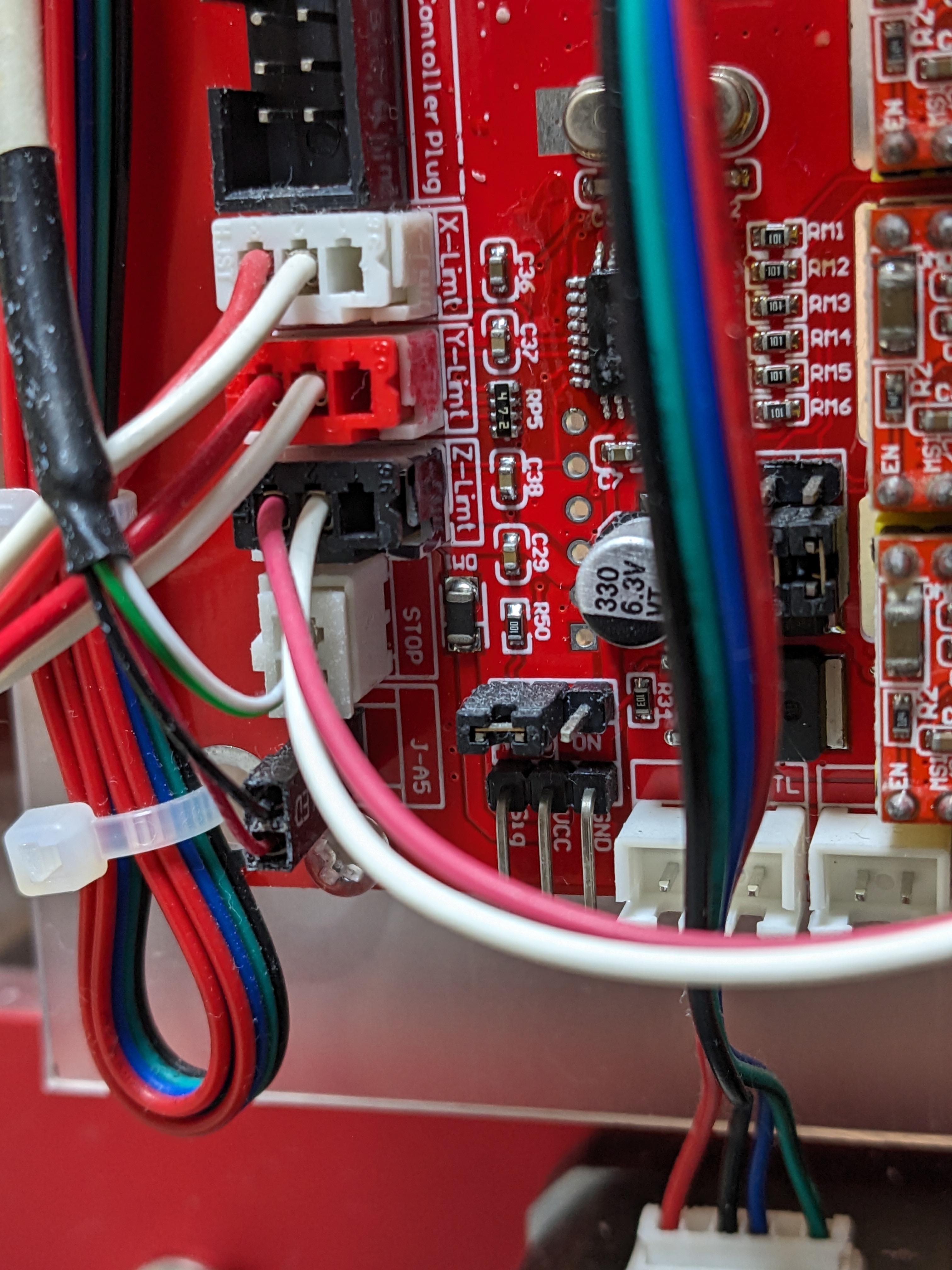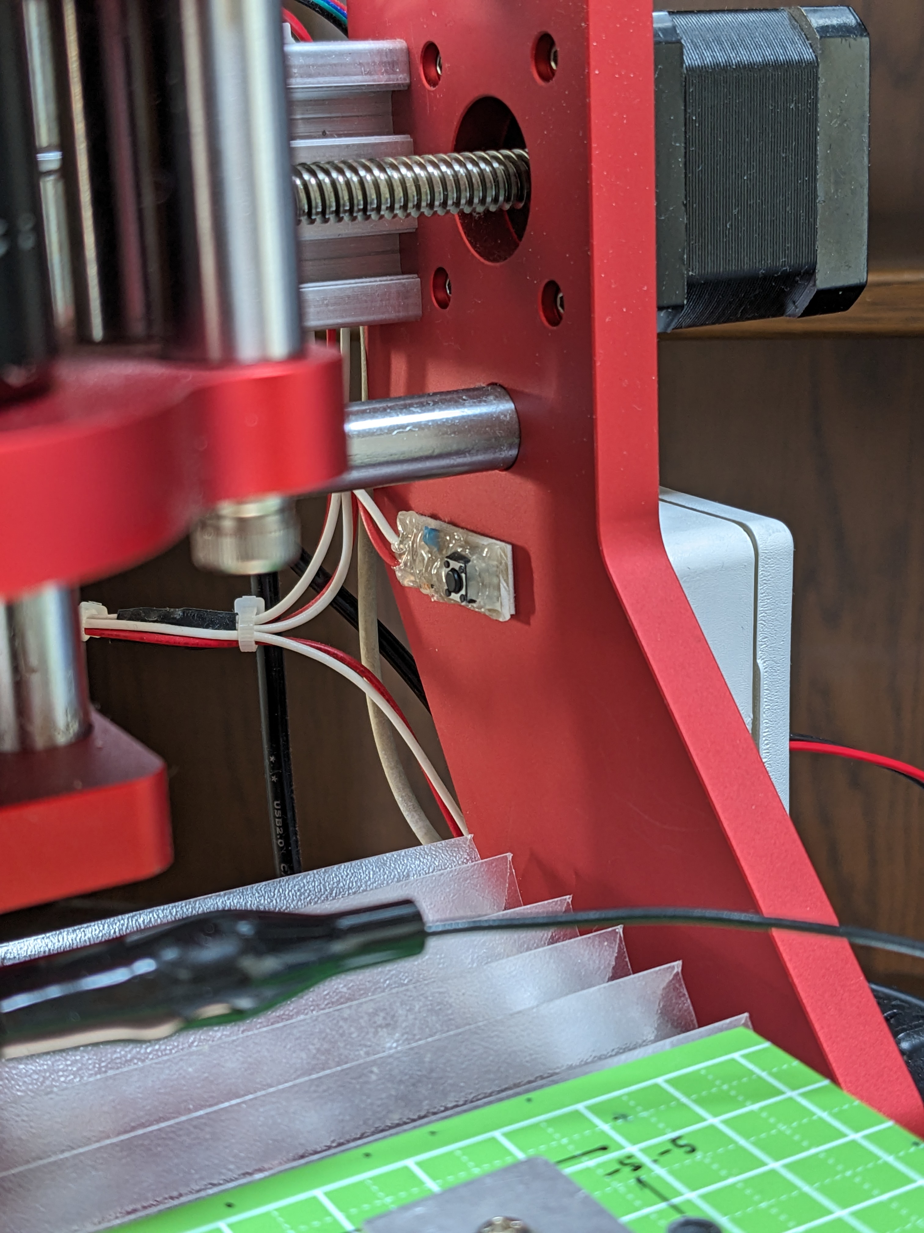 ハードウェアリミットスイッチです。 右側(X軸正方向)用です。スイッチの取り付けは考慮されていないようでして取付穴などはありません。マイクロSWを使用するとワークスペースが狭くなるのでタクトスイッチを使用しました。ヘッドやワークベンチが限界に到達したときにスイッチに接触する位置に両面テープで張り付けました。 |