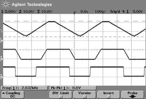 コンパレータも専用ICでなくてもLF412で十分な立ち上がりがあります。CH1がLM324による発振波形、CH3(中)はLM324によるコンパレーター、CH2(下)はLF412によるコンパレーター波形です。