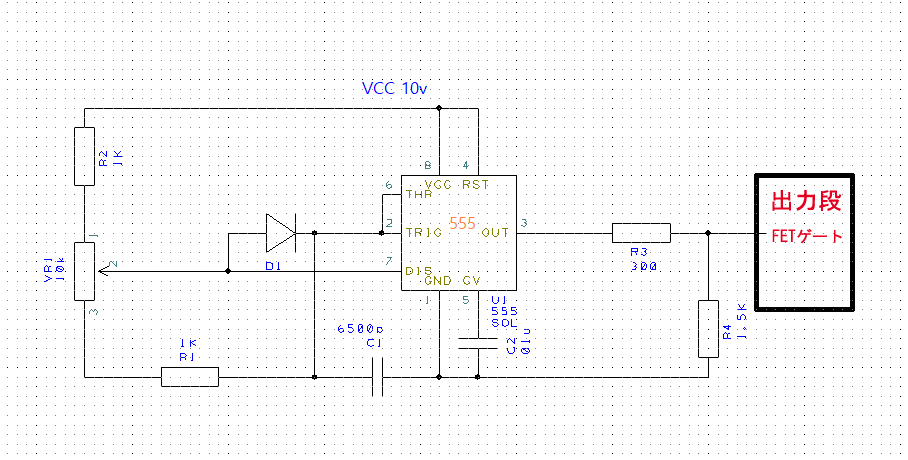 現在でも多く使われている。昔から存在するアナログタイマーICです。初期の頃はバイポーラトランジスタで製造されていましたが 現在はCMOSタイプが主流のようです。私の感覚でアナログ回路でPWMといえば「三角波発振回路の出力をコンパレータで受ける。比較電圧をボリューム等で 可変して希望のデューティを得る」というものです。JRC社のNJM555データシートに応用回路例が載っており、ある程度可変である とは思っていましたが0~100%変化を期待する用途に使用するとは考えても見ませんでした。 (基板の説明には0~100%とは書いて有りません。)