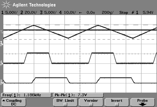 発振波形を図示します。ch1が三角波(7pin)、ch3が比較電圧(9pin)この二つは0点を重ねてあります。2は発振器(1pin)、4がコンパレータ出力(8pin)