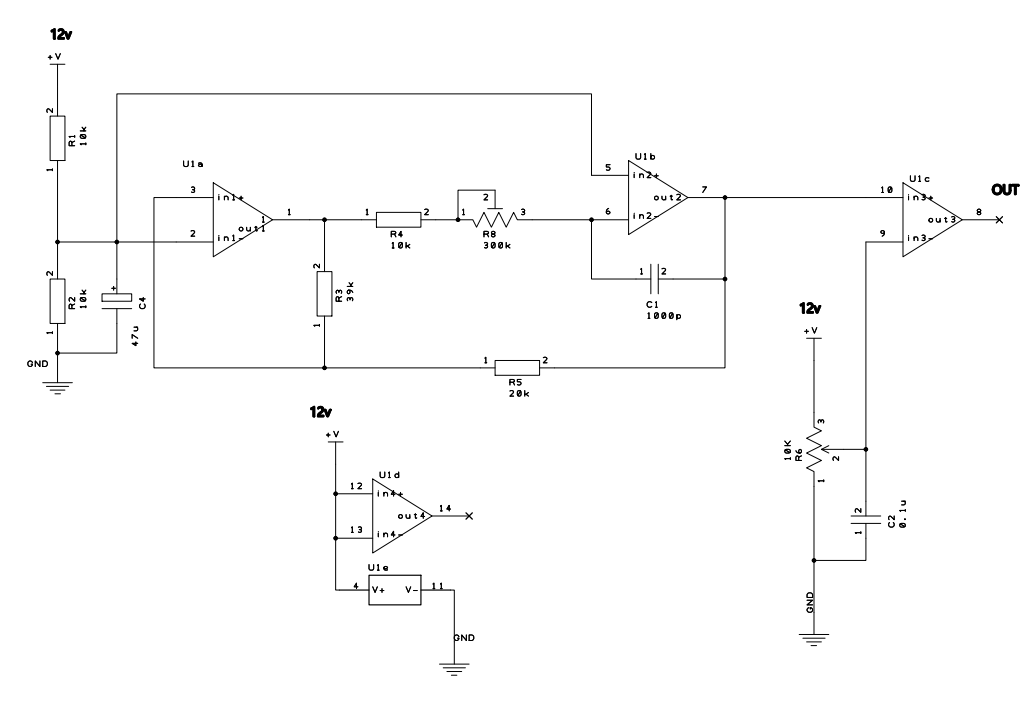 始めに三角波発振回路を図示します。オペアンプはLM324,電源電圧は12vです。