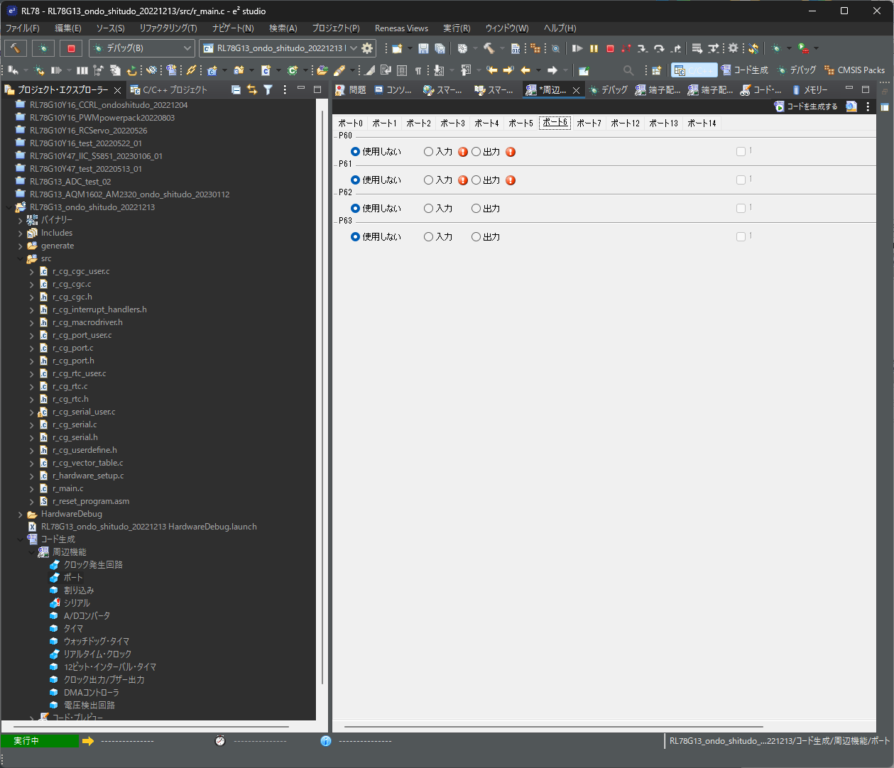 必要な機能をpinに割り当てるのですがポート(単純な入出力)は最後に設定するのがやりやすそうです。例えばIIC(IICA0)を「使う」にするとP60、P61はポート機能設定ができなくなります。 残ったpinを入出力に設定するのが早道です。ただしパラレルLCDでは最低4bitは並んでいないとしかも0~3bitでないと非常に使いにくいと思います。8bitデータの操作だとなおさらです。動作クロック