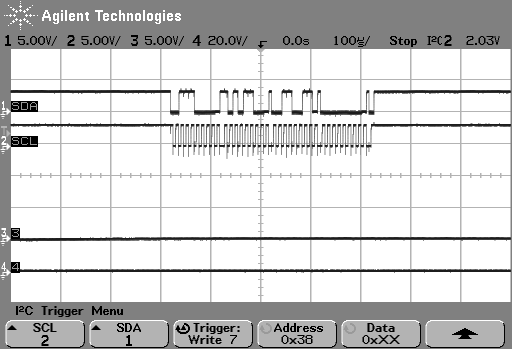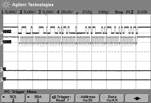 IIC 7bitアドレス:0x38(0x70)writeのタイミングでトリガーしています。トリガー点は左に寄せています。 トリガー点に当たるwriteがDHT20を起動するタイミングにあたり、アドレス0x38(0x70)、0xac,0x33,0x00が送られます。 80msec待ってから読みだせとありましたが60msecしか確保出来ていないようです。問題無しとするかタイミングを増やすか・・・。