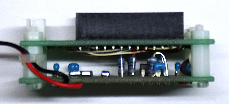 小型にするため電源スイッチは有りません。電池は単4または単5を3本使用しています。多分LR44あたりでは電流容量不足になるだろう。単5なら 重量は何とかクリア?ぐらいな気持ちで選択しています。
