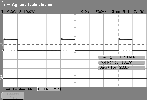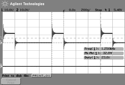 出力波形 J4の1-2間 モーター端子間は(多分)チョークコイルが無い方がリンギングが少ないと思いますがPCから出るノイズはこちらのほうが少なかったです。(実験中の基板->E1->PCと繋がっています) |
