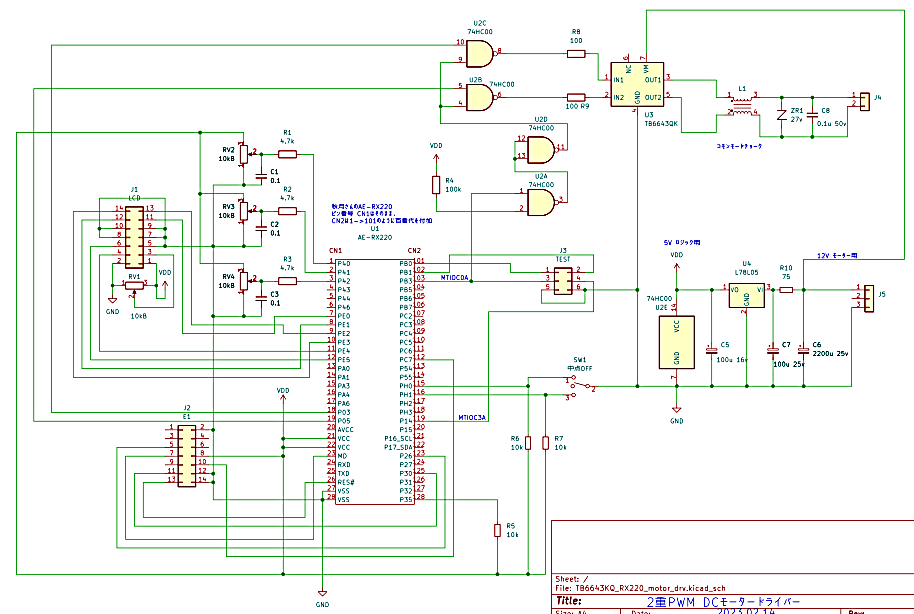 MPUは秋月さんのAE-RX220基板を、モータードライバーには東芝:TB6643QK(こちらも秋月さんで購入)を使用します。表示はなくても良いと思いますがPWMの値調整にE1エミュレーターの表示だけでは面倒なので取り付けました。これもまた秋月さんで購入したACM1602K-NLW-BBWです。 |