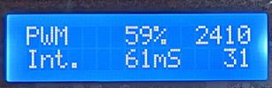 実用上表示は必要ありませんので飾りです。 1行目PWMはメインボリューム位置が表示されます。12bit:4095がMAX値です。 2行目Int.はサブボリューム:インターバル周期、そのうち31mSecがHi時間です。出力が上がると0mS 1 の表示になりますが100%Hiの状態です。 |