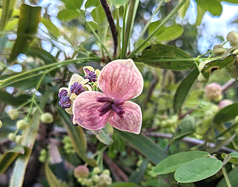 これはアケビ、実家の庭に咲いていました。子供の頃(50~60年前)には見かけませんでした。ネット上の植物図鑑によると手前が雄花、後ろ3つが雌花らしいです。